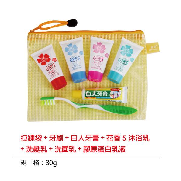 ●內容物:拉鍊袋 + 牙刷 + 白人牙膏 + 沐浴乳 + 洗髮乳 + 洗面乳 + 膠原蛋白乳液
