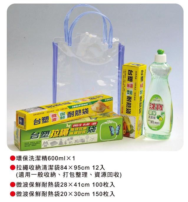 ●環保洗潔劑 600ml X1 ●拉繩收納清潔袋 84X95cm 12入 ●微波保鮮耐熱袋 28 X41cm 100枚入 ●微波保鮮耐熱袋 20 X30cm 150枚入