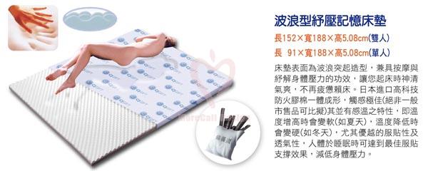 床墊表面為波浪突起造型,兼具按摩與紓解身體壓力的功效,讓您起床時神清氣爽,不再疲憊賴床。 日本進口高科技防火膠棉一體成形,觸感絕佳(絕非一般市售品可比擬)其並有感溫之特性,即溫度增高時會變軟(如夏天),溫度降低時會變硬(如冬天),尤其優越的服貼性及透氣性,人體於睡眠時可達到最佳服貼支撐效果,減低身體壓力。 ●雙人尺寸:長152 X寬188 X 高5.08 cm ●單人尺寸:長91 X寬188 X 高5.08 cm